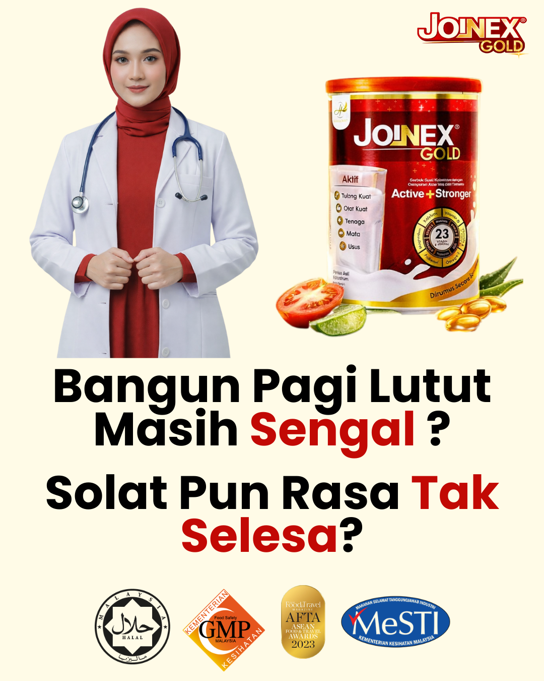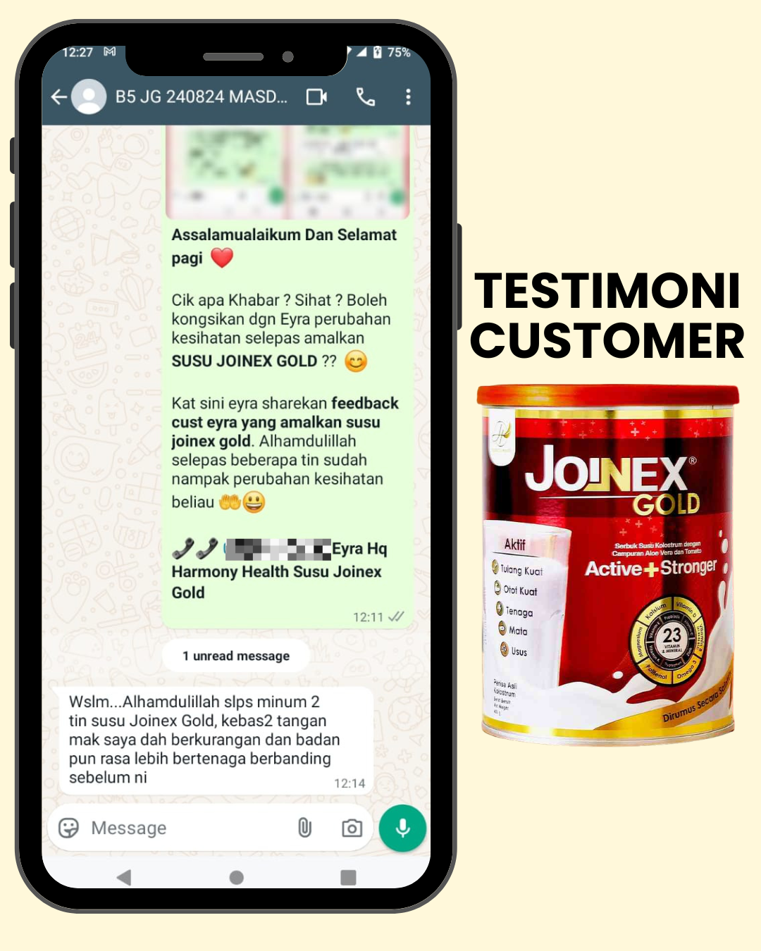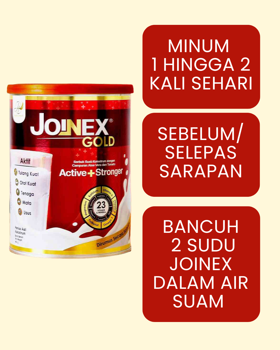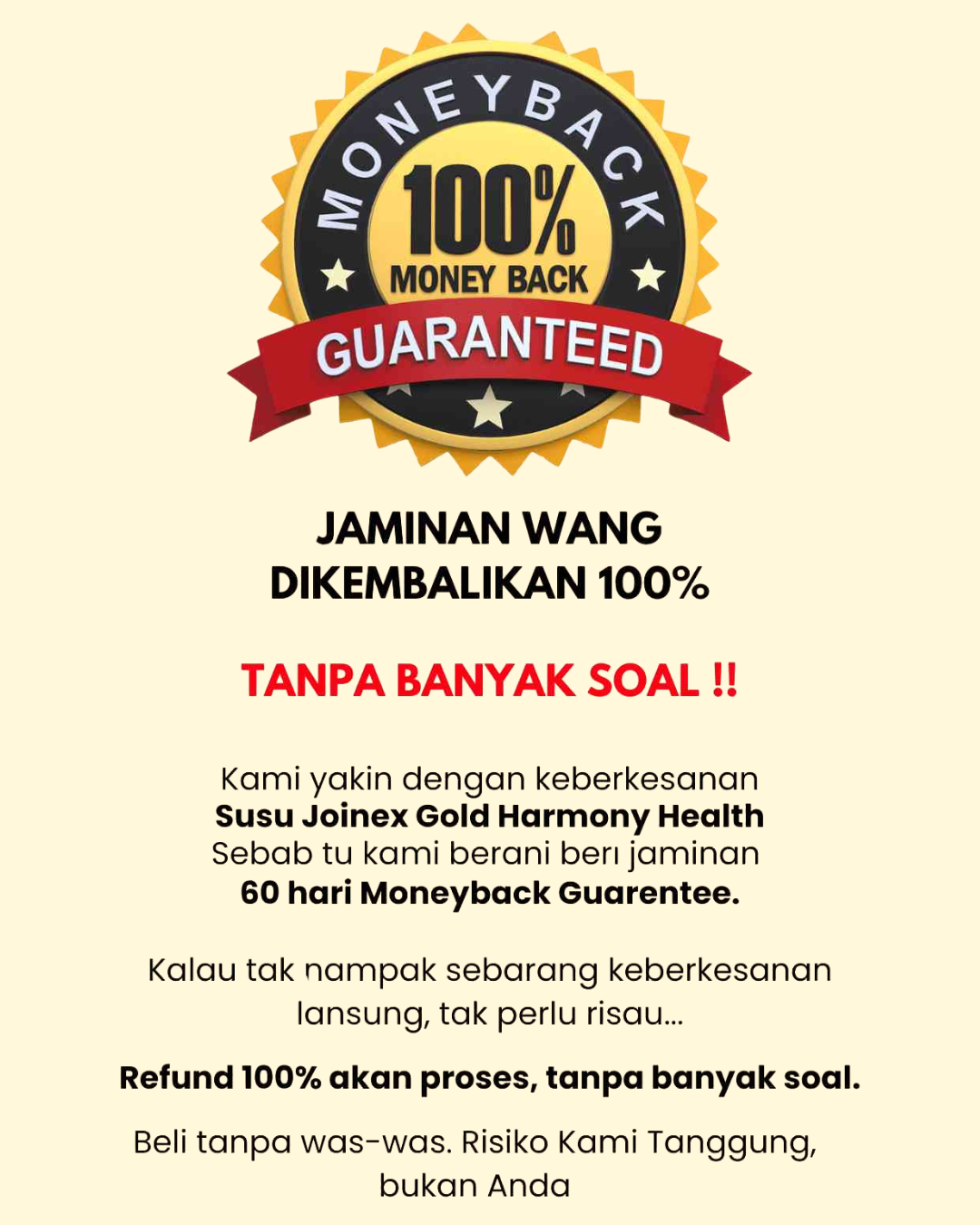 LEGAL DISCLAIMER: These products are not intended to diagnose,prevent,treat, or cure any disease.*PENAFIAN: Keberkesanan Susu Joinex Gold mungkin berbeza mengikut keadaan individu. Hasil setiap pengguna tidak semestinya sama kerana ia bergantung kepada faktor kesihatan, cara pemakanan dan gaya hidup. Produk ini adalah suplemen nutrisi dan bukan ubat. Untuk kesan terbaik, amalkan secara konsisten mengikut cara yang disyorkan. InsyaAllah, dengan izin Tuhan, usaha ikhtiar anda akan memberi manfaat.*DISCLAIMER: Results may vary for each individual. Testimonials shared are genuine customer experiences but may not reflect typical results. This product is a nutritional supplement and is not intended to diagnose, treat, cure, or prevent any disease. Outcomes depend on personal health condition, diet, lifestyle, and consistency of use.