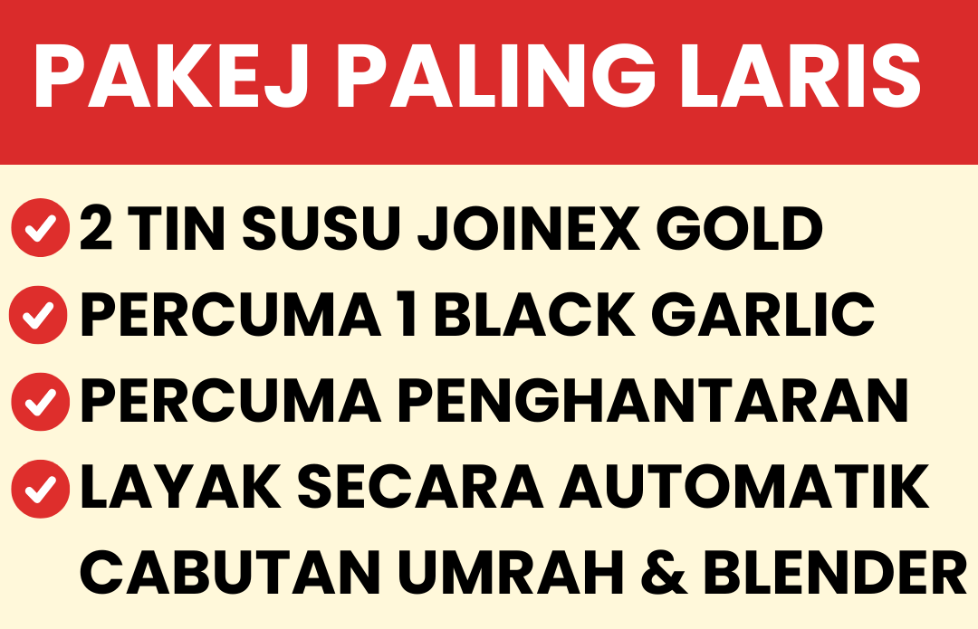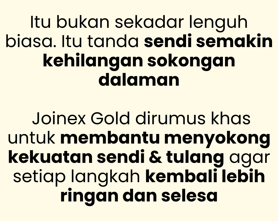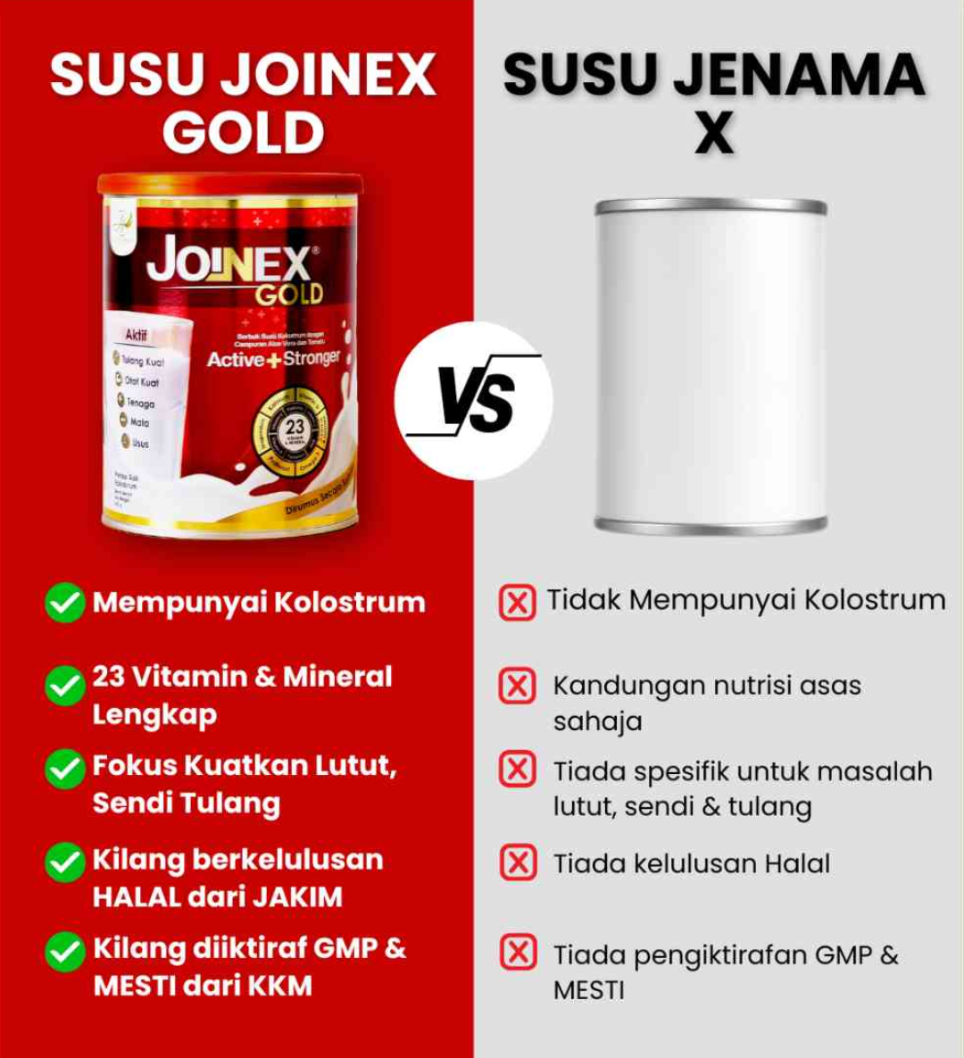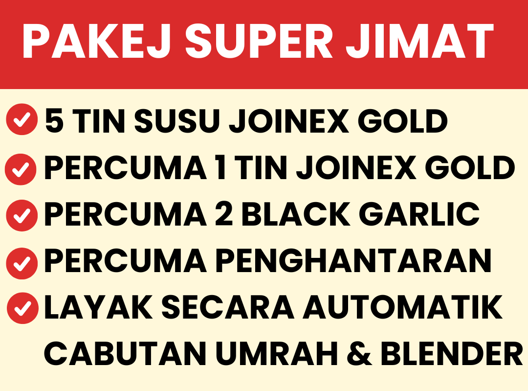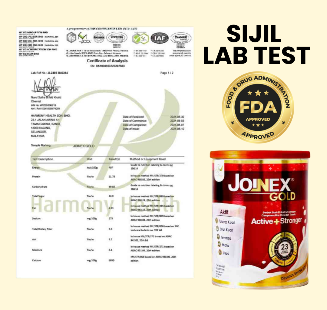 LEGAL DISCLAIMER: These products are not intended to diagnose,prevent,treat, or cure any disease.*PENAFIAN: Keberkesanan Susu Joinex Gold mungkin berbeza mengikut keadaan individu. Hasil setiap pengguna tidak semestinya sama kerana ia bergantung kepada faktor kesihatan, cara pemakanan dan gaya hidup. Produk ini adalah suplemen nutrisi dan bukan ubat. Untuk kesan terbaik, amalkan secara konsisten mengikut cara yang disyorkan. InsyaAllah, dengan izin Tuhan, usaha ikhtiar anda akan memberi manfaat.*DISCLAIMER: Results may vary for each individual. Testimonials shared are genuine customer experiences but may not reflect typical results. This product is a nutritional supplement and is not intended to diagnose, treat, cure, or prevent any disease. Outcomes depend on personal health condition, diet, lifestyle, and consistency of use.