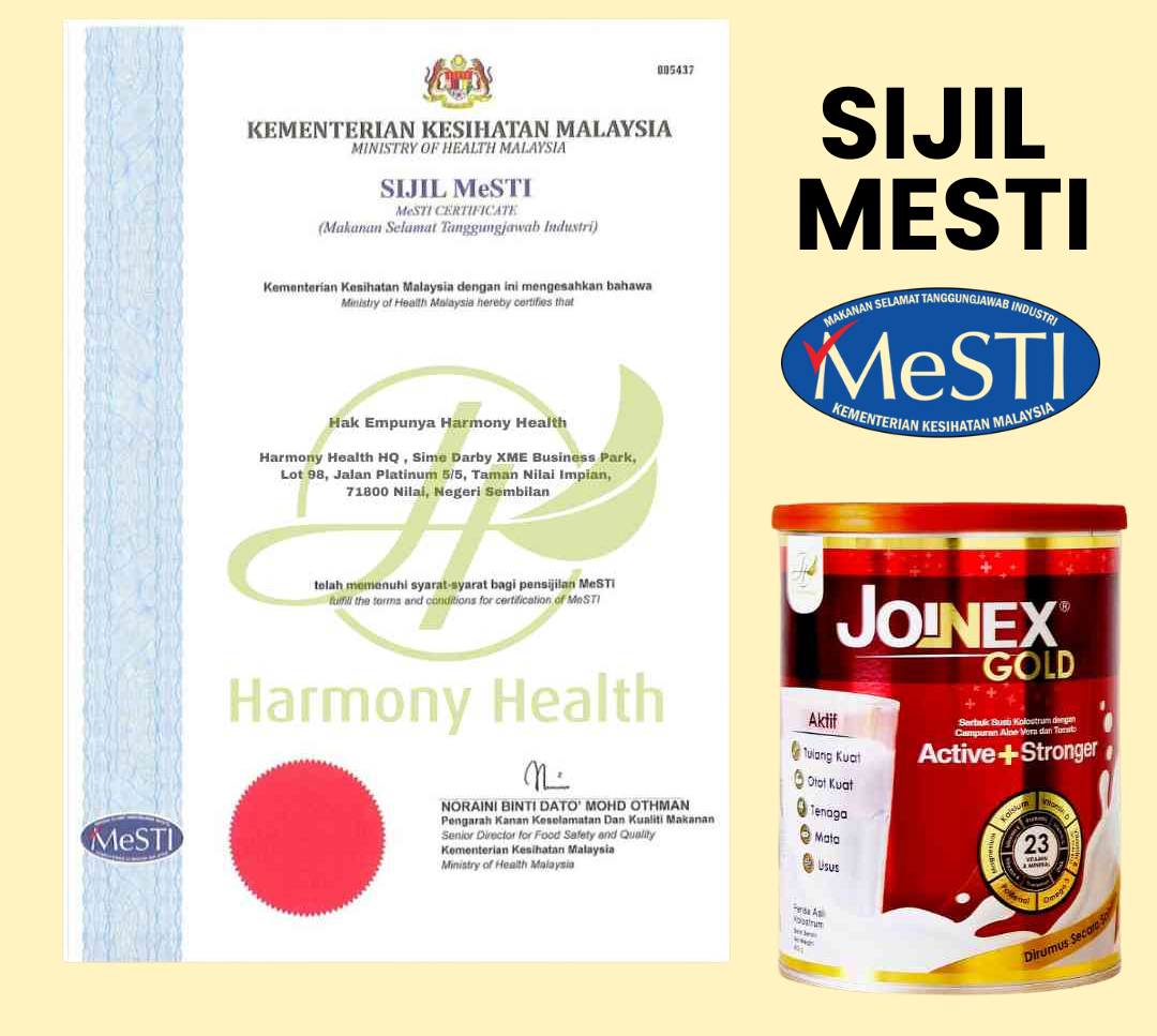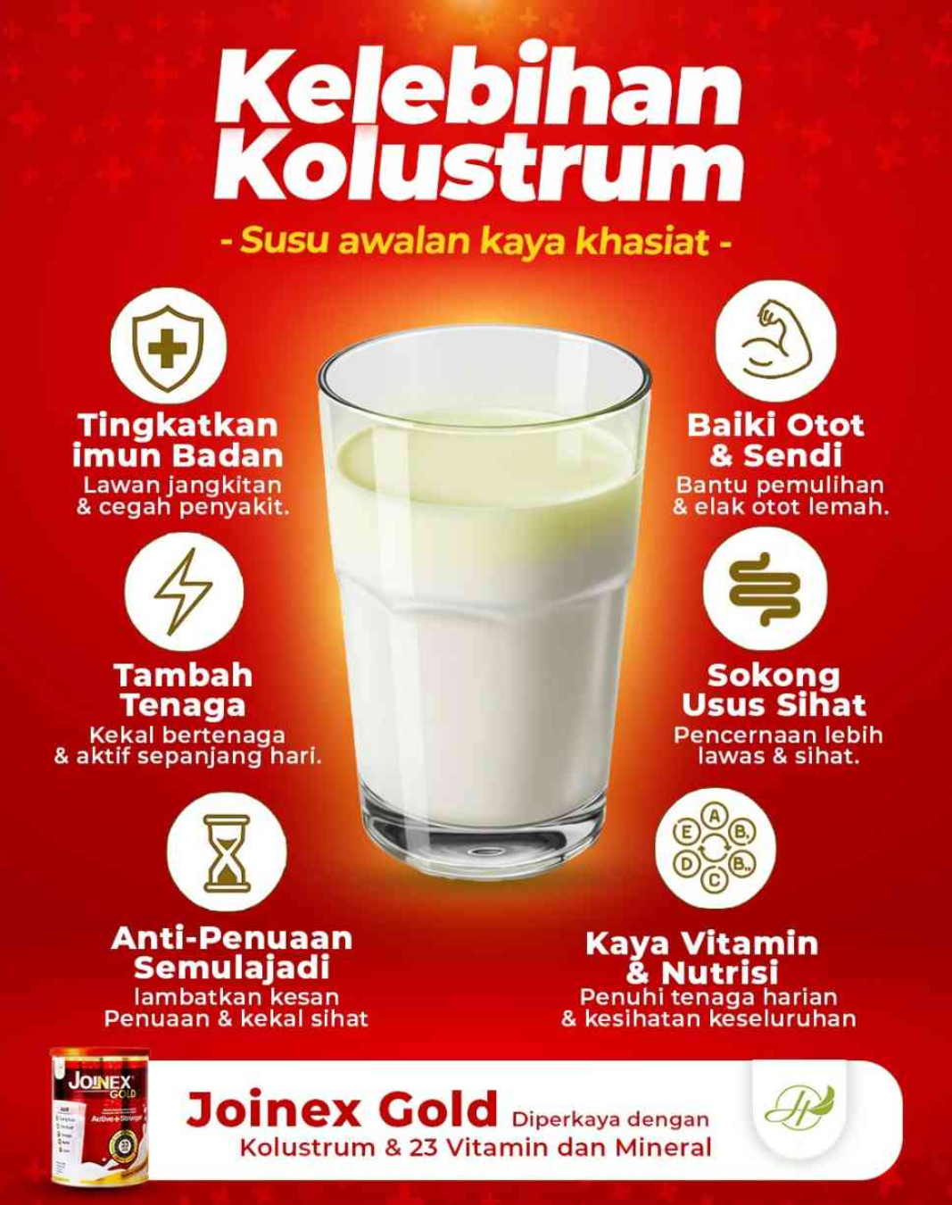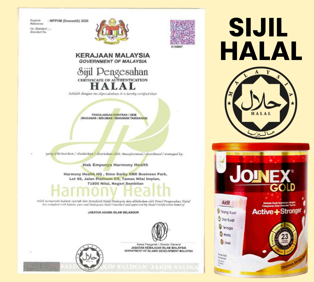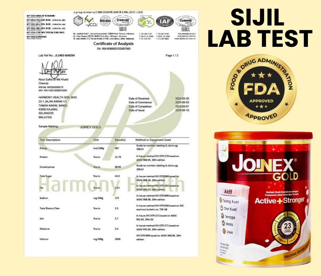 Joinex Gold diformulasi daripada susu kolostrum premium, vitamin & mineral. Tiada bahan terlarang. Namun individu yang ada penyakit kronik digalakkan rujuk doktor sebelum ambil.
