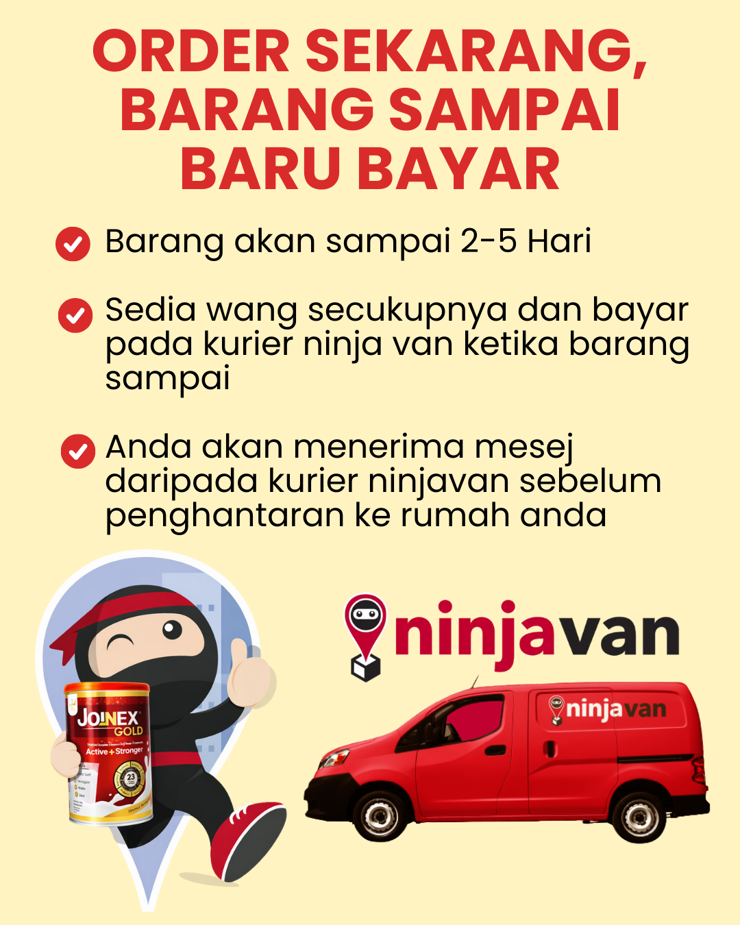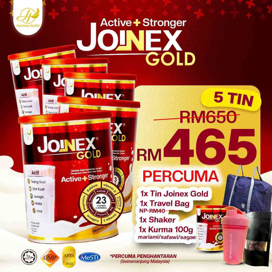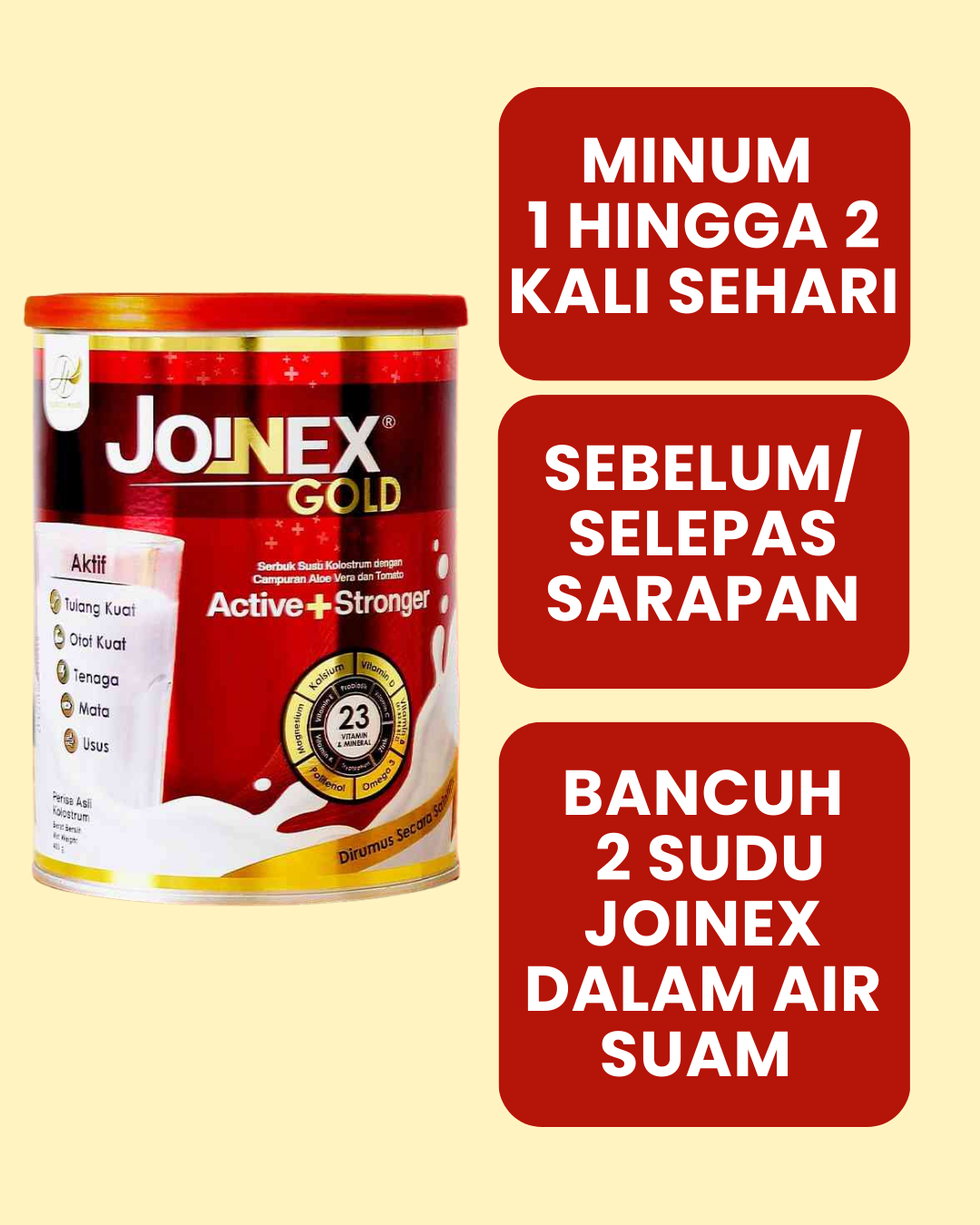 Bancuh 2 sudu (25g) Joinex Gold dengan segelas air suam. Minum 1–2 kali sehari, sebaiknya waktu pagi sebelum sarapan & malam sebelum tidur.