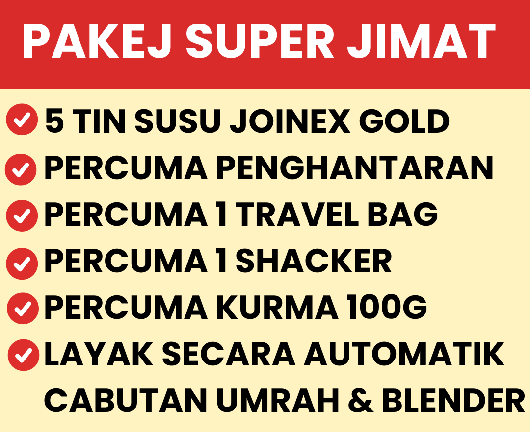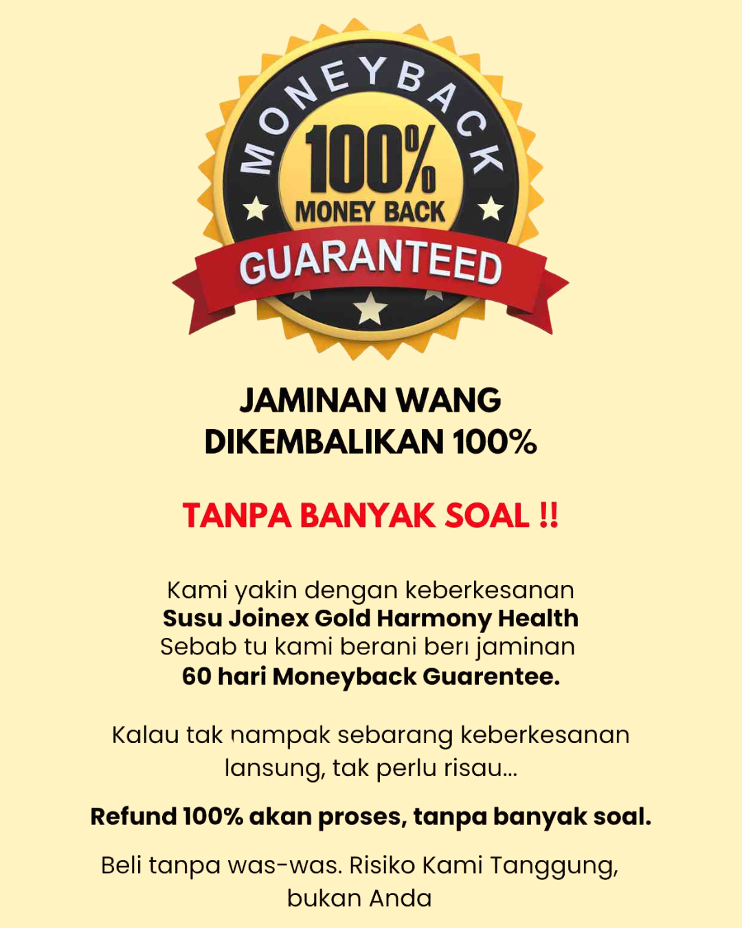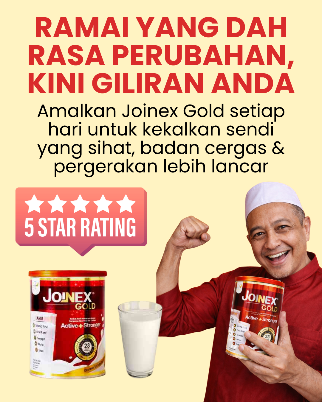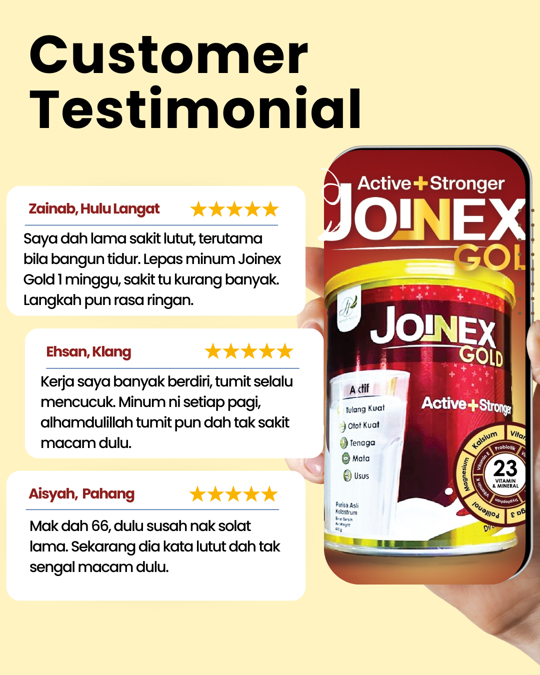 LEGAL DISCLAIMER: These products are not intended to diagnose,prevent,treat, or cure any disease.*PENAFIAN: Keberkesanan Susu Joinex Gold mungkin berbeza mengikut keadaan individu. Hasil setiap pengguna tidak semestinya sama kerana ia bergantung kepada faktor kesihatan, cara pemakanan dan gaya hidup. Produk ini adalah suplemen nutrisi dan bukan ubat. Untuk kesan terbaik, amalkan secara konsisten mengikut cara yang disyorkan. InsyaAllah, dengan izin Tuhan, usaha ikhtiar anda akan memberi manfaat.*DISCLAIMER: Results may vary for each individual. Testimonials shared are genuine customer experiences but may not reflect typical results. This product is a nutritional supplement and is not intended to diagnose, treat, cure, or prevent any disease. Outcomes depend on personal health condition, diet, lifestyle, and consistency of use.